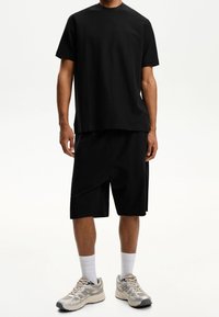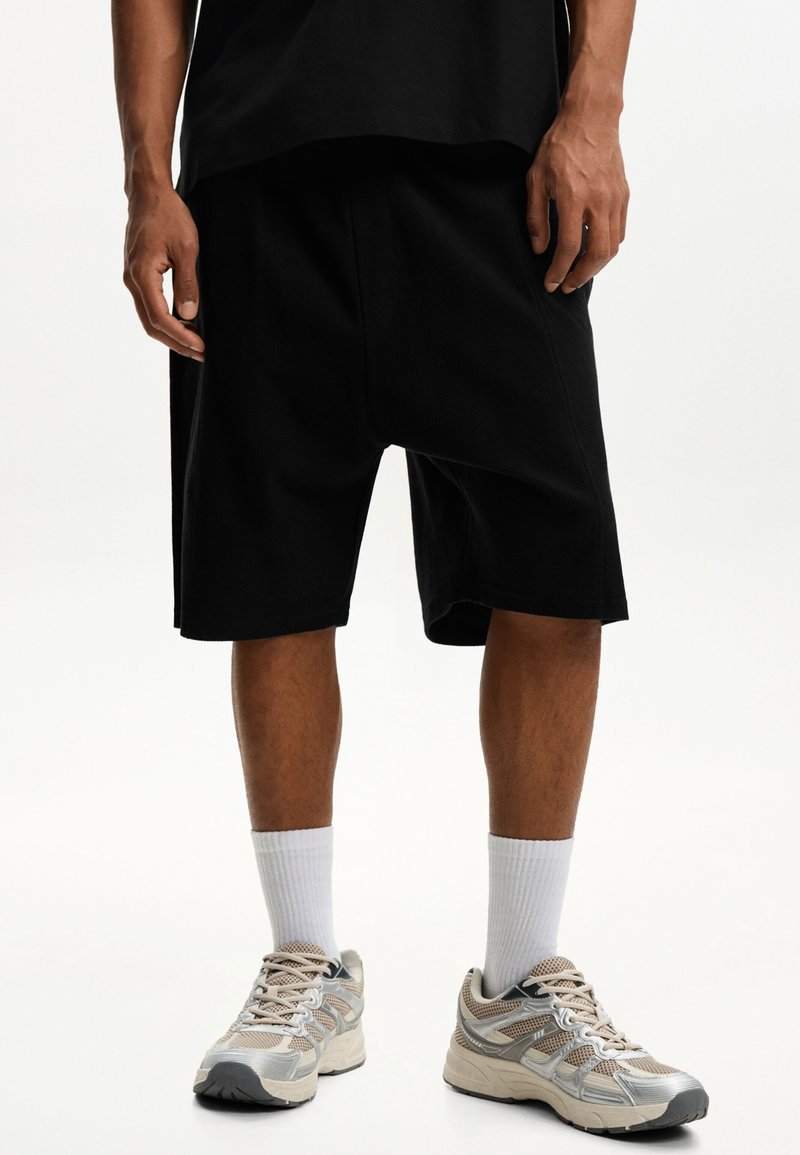 Personne portant un short noir jusqu'aux genoux, des chaussettes blanches, et des chaussures de course beiges et argentées, se tenant sur un fond blanc uni.