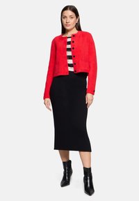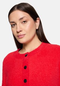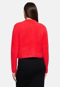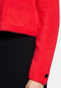 Cardigan rouge court en tissu texturé duveteux, avec des boutons noirs et deux poches avant. Manches longues et encolure ronde.