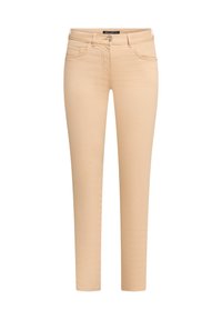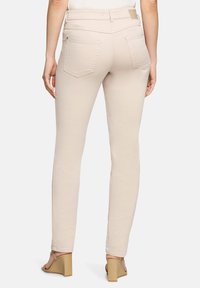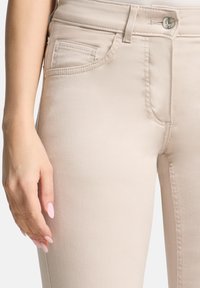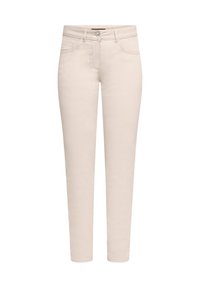 Jean beige slim ajusté avec passants pour ceinture, poches avant et une fermeture classique à boutons. Le tissu a une texture lisse. Associé à des sandales à talons.