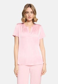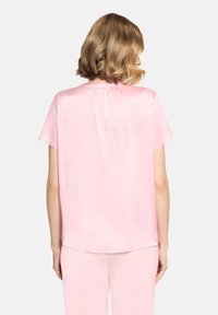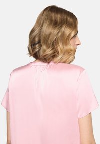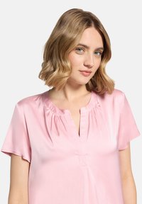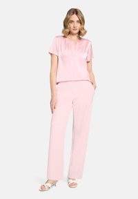 Femme aux cheveux blonds portant un chemisier en satin rose clair à manches courtes et un pantalon rose assorti, posant devant un fond uni.