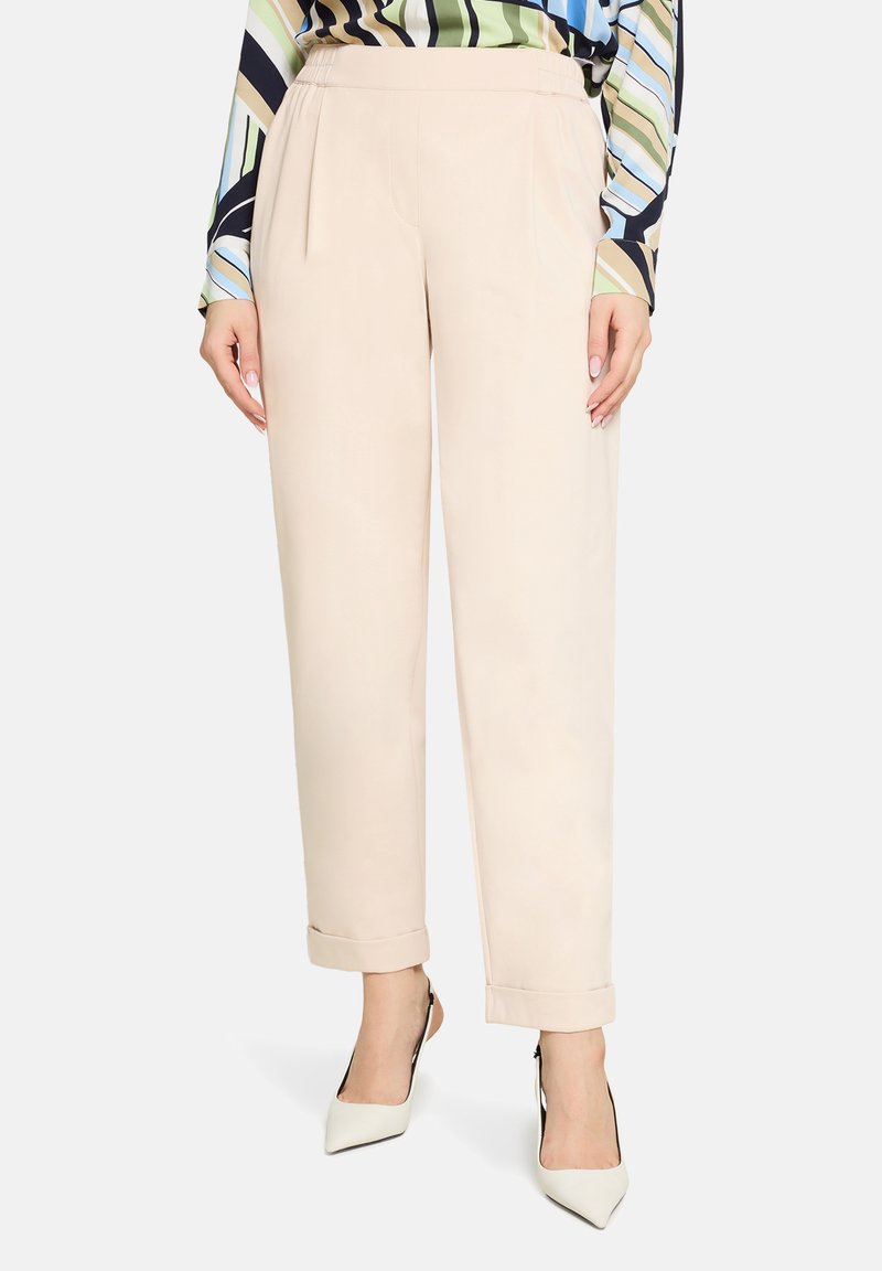 Pantalon beige sur mesure avec une texture lisse, offrant une coupe décontractée, des plis à l'avant et des revers roulés. Porté avec des talons blancs.