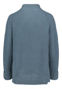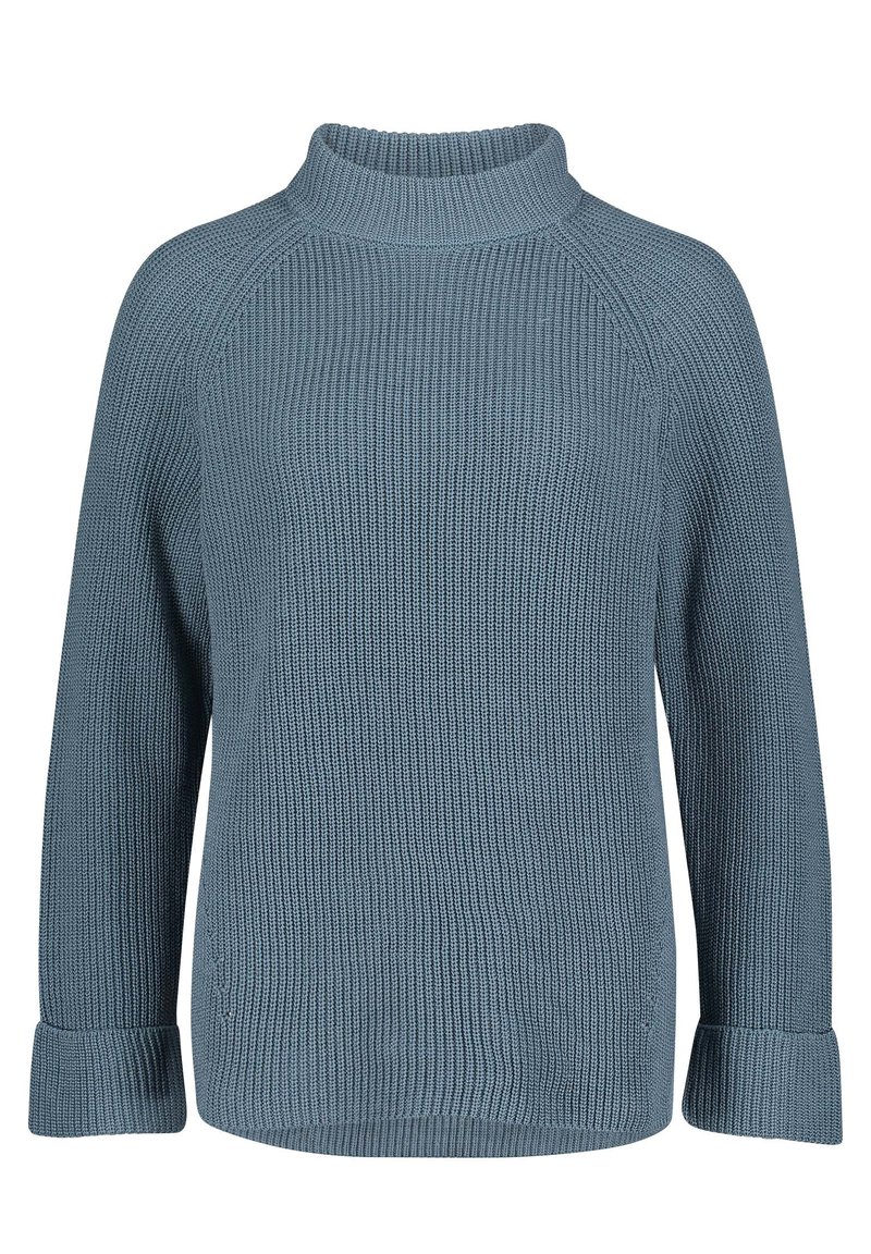 Pull tricoté bleu avec un col montant, manches raglan et texture côtelée. Dispose de poignets pliés et d'une coupe décontractée.