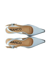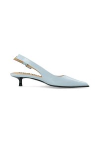 Chaussure slingback bleu clair à bout pointu avec un petit talon kitten noir et une bride à boucle argentée sur fond blanc.
