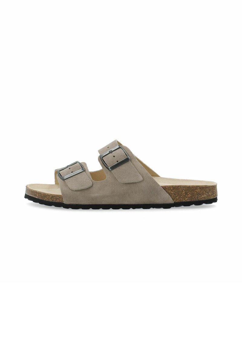 Sandale beige en daim à enfiler avec deux boucles métalliques réglables, semelle intérieure en liège et semelle extérieure en caoutchouc noir texturé.
