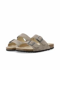 Sandale en suède gris clair avec deux sangles ajustables et des éléments en laiton, dotée d'une semelle en liège contournée et d'une semelle en caoutchouc texturé.