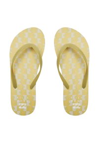 Chinelle jaune avec une semelle texturée présentant un motif à carreaux. Fines sangles en caoutchouc, design simple et construction légère.