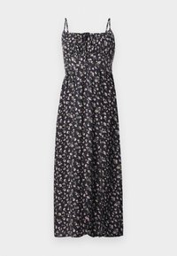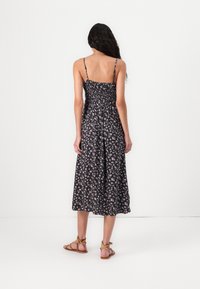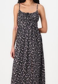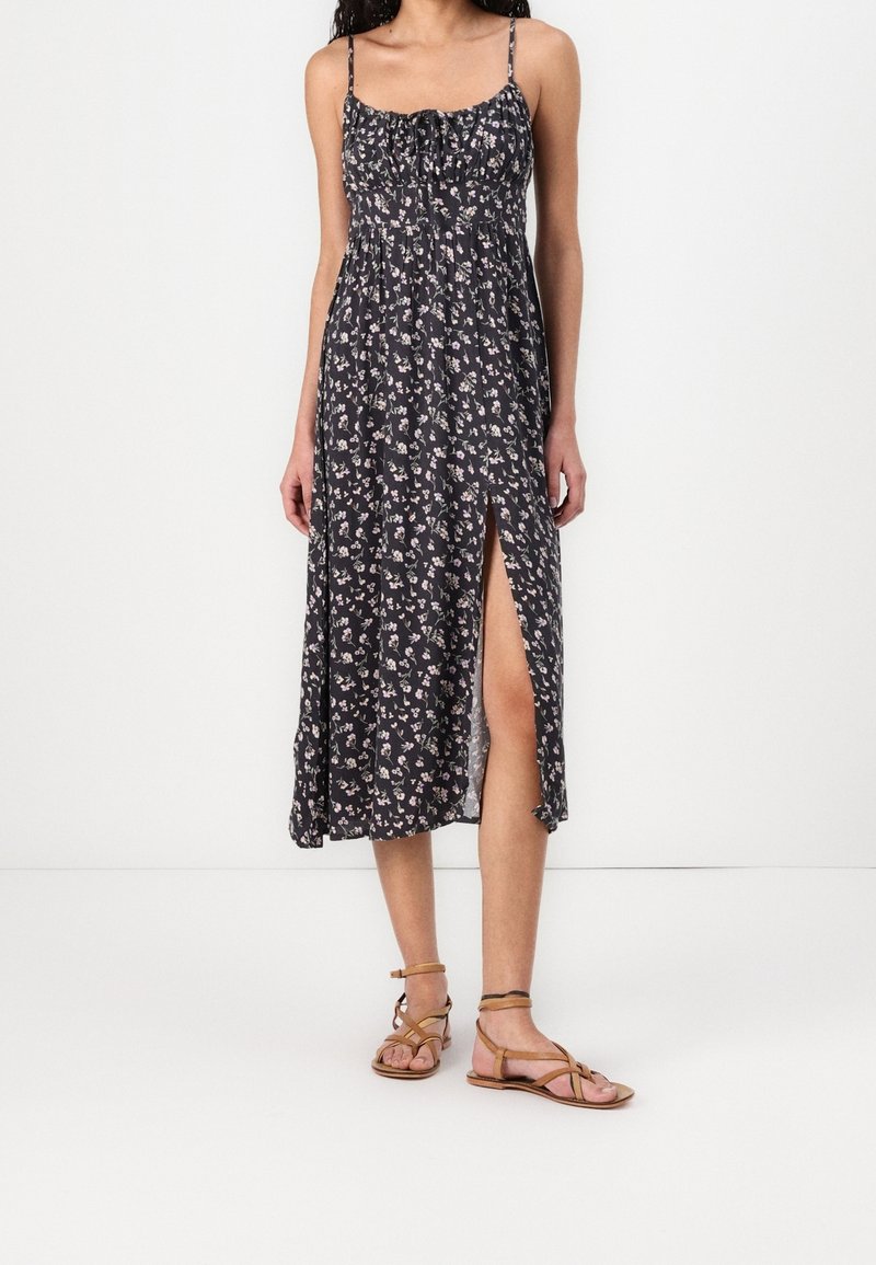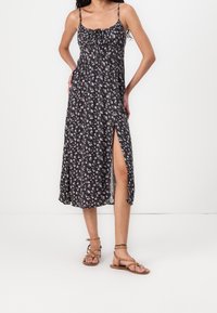 Femme portant une robe midi florale noire avec bretelles spaghetti et une fente haute sur la cuisse, associée à des sandales plates marron à lanières.