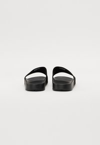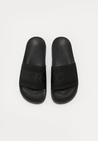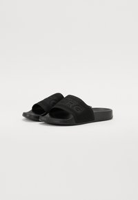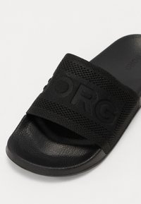 Chausson noir avec une sangle en mesh texturé, semelle en caoutchouc plate et détail de logo en relief sur le dessus. Design simple et minimal.