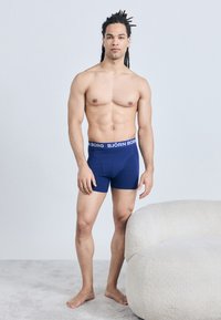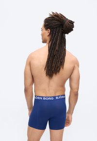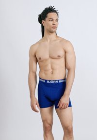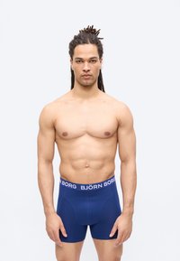 Homme en forme avec de longs cheveux tressés, debout pieds nus en boxer bleu marine Björn Borg, devant un fond uni, à côté d'une chaise blanche arrondie.