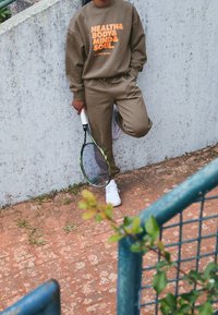 Personne portant un survêtement marron avec le texte "Santé & Corps & Esprit & Âme" sur le sweat-shirt, tenant une raquette de tennis sur un court en terre battue.