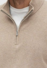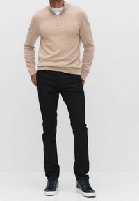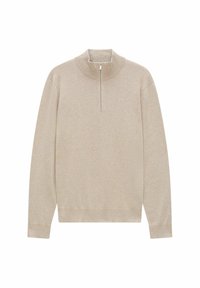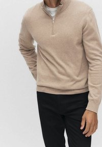 Homme portant un pull beige à demi-fermeture éclair sur une chemise blanche et un pantalon noir, la main droite posée sur la hanche, devant un fond uni.