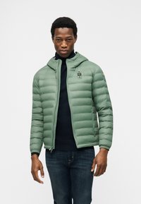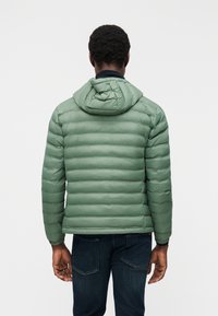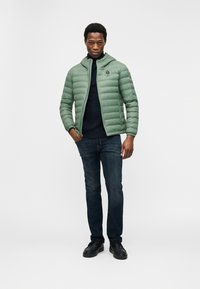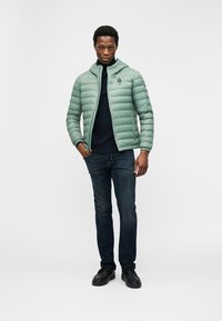 Jeune homme portant une doudoune à capuche vert clair sur un t-shirt noir et un jean foncé, debout devant un fond blanc uni.