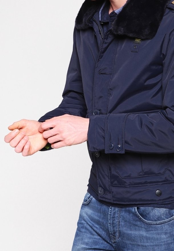Homme portant une veste bleu foncé avec un col en fourrure noire ajustant la manche, assortie à un jean bleu, sur un fond blanc uni.
