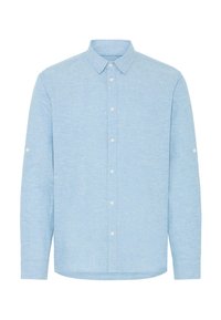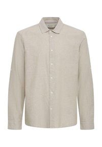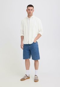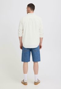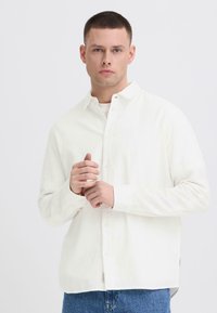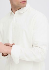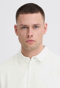 Jeune homme portant une chemise blanche boutonnée et un jean bleu, debout devant un fond clair uni, ajustant le poignet gauche de sa chemise.