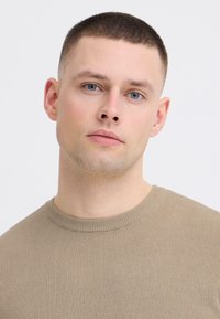 Jeune homme aux cheveux courts portant un pull en tricot beige et un jean bleu, debout avec le bras gauche croisé sur la poitrine, sur fond blanc.
