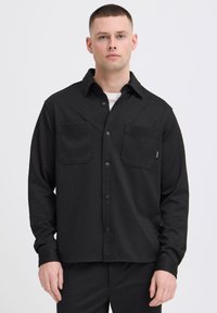 Chemise noire à manches courtes à boutons avec deux poches poitrine, en tissu lisse, avec un patch logo près de l'ourlet. Le modèle porte un pantalon noir.