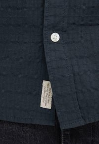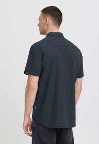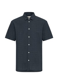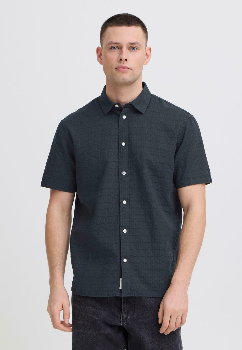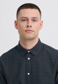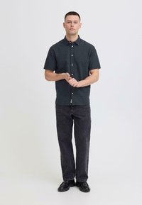 Jeune homme portant une chemise à manches courtes boutonnée texturée foncée et un pantalon noir, debout devant un fond clair uni.
