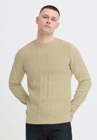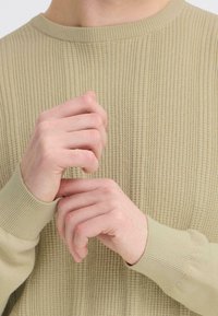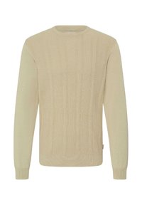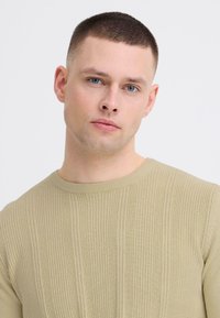 Jeune homme aux cheveux courts portant un pull côtelé beige et un jean foncé, debout les mains derrière le dos sur un fond uni.