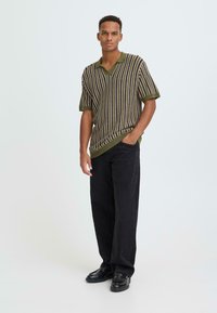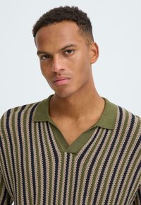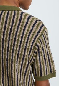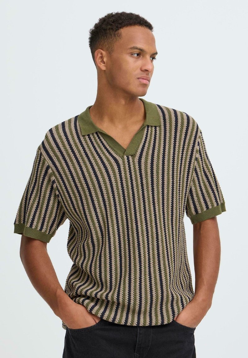 Polo tricoté à rayures vertes, beiges et bleu marine. Doté d'un col en V et de manches courtes côtelées. Tissu texturé avec une coupe décontractée.