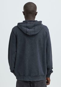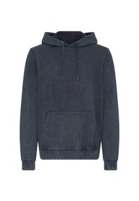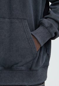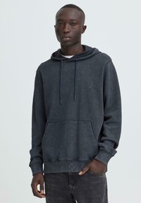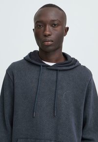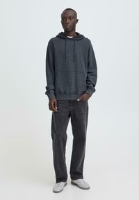 Sweat à capuche gris foncé avec cordon de serrage, poche kangourou et poignets côtelés. Présente un petit logo brodé sur la poitrine.