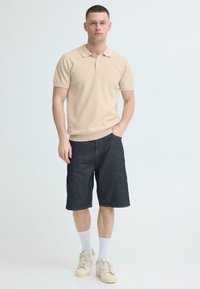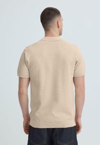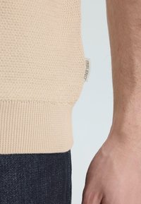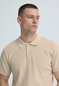 Homme aux cheveux courts portant un polo à manches courtes beige texturé, les mains jointes, regardant vers la droite sur un fond clair uni.