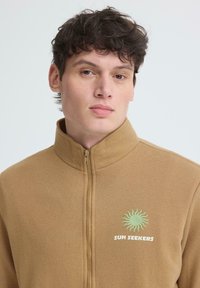 Jeune homme portant une veste polaire marron clair zippée avec un logo de soleil vert et le texte « SUN SEEKERS » sur la poitrine, associée à un jean foncé.