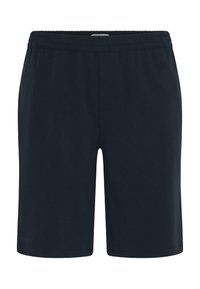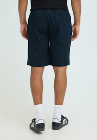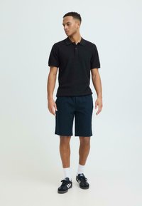 Homme portant un short bleu marine jusqu'aux genoux, des chaussettes blanches courtes et des baskets Adidas noires à rayures blanches, debout les mains dans les poches.