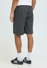 Homme portant un short à rayures verticales noires et blanches avec un cordon de serrage, des chaussettes blanches et des baskets Adidas noires, debout devant un fond uni.