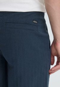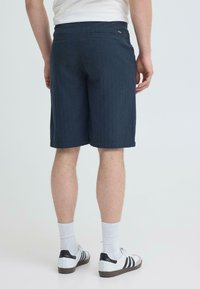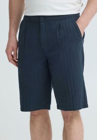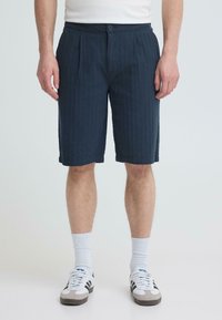 Homme portant un short bleu marine ajusté, des chaussettes blanches et des baskets blanches avec des rayures noires, debout devant un fond neutre.