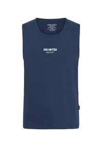 Débardeur gris sans manches en tissu doux, avec un col arrondi et un imprimé noir "UNLIMITED" sur le devant.