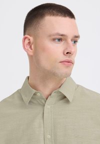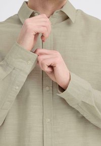 Homme portant une chemise beige à manches longues avec boutons et un pantalon foncé à poches, debout devant un fond blanc uni.