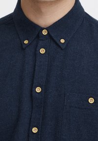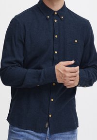 Homme portant une chemise boutonnée bleu marine foncé avec des boutons couleur camel et une poche poitrine, associée à un jean bleu, mains jointes à hauteur de la taille.