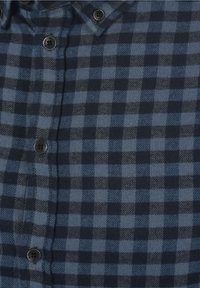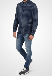 Homme portant une chemise à carreaux bleu marine et noire à manches longues avec des boutons, et un jean bleu clair, une main dans la poche.
