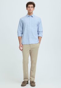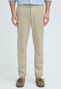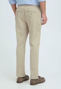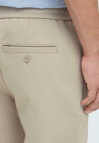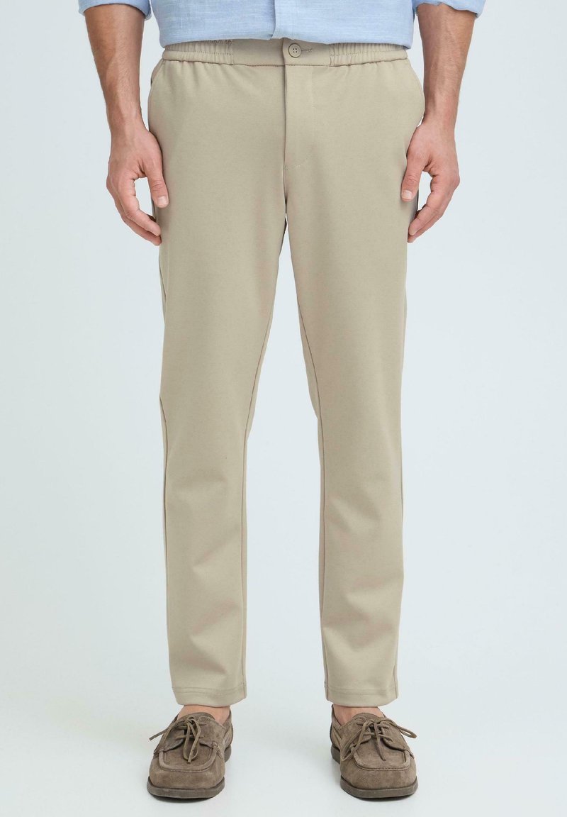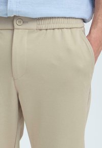 Homme portant un pantalon beige décontracté avec taille élastique et bouton, assorti à des mocassins en daim marron, debout devant un fond uni.