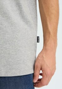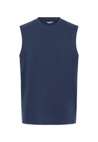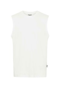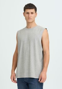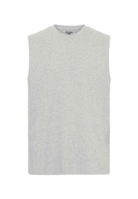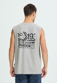 T-shirt sans manches gris avec un design graphique imprimé au dos, comprenant du texte et des éléments géométriques en noir. Texture douce, coupe décontractée.