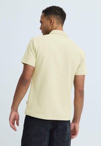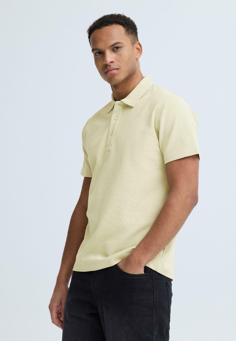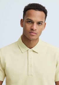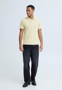 Jeune homme debout, une main dans la poche, portant un polo à manches courtes jaune clair et un pantalon foncé, sur fond uni.