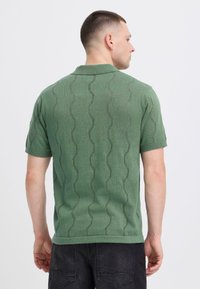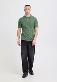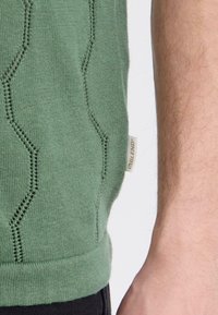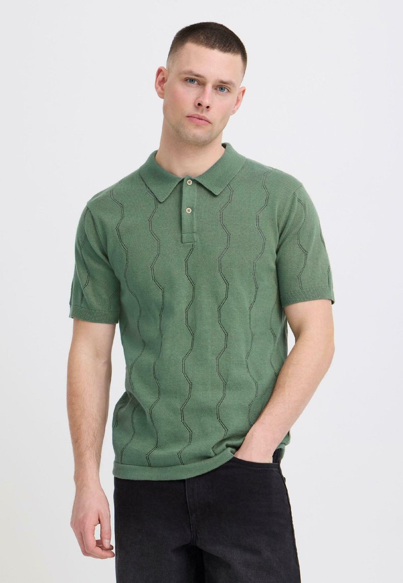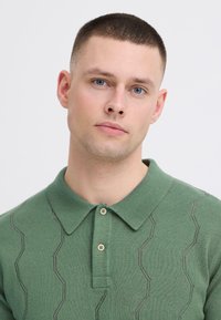 Jeune homme aux cheveux courts portant un polo en maille vert à motif en zigzag et un pantalon noir, debout avec une main dans la poche.