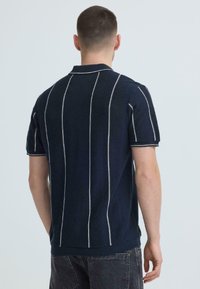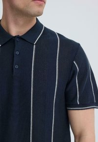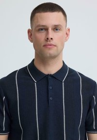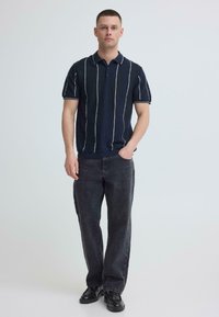Homme portant un polo à manches courtes bleu marine avec des rayures verticales blanches et un jean foncé, debout contre un fond clair uni.