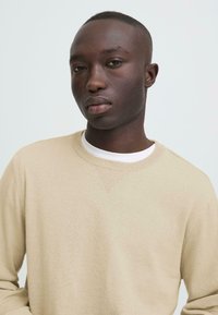 Homme portant un pull beige à col rond et un jean foncé, debout les mains jointes, regardant sur le côté devant un fond uni.