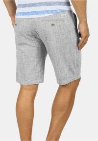 Shorts en lin gris avec une finition texturée, dotés d'une taille élastique avec cordon de serrage et de poches latérales. Portés avec une chemise rayée bleu et blanc.