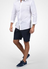 Homme portant un short décontracté bleu marine, une chemise blanche rentrée, et des baskets bleu marine se tenant devant un fond uni.