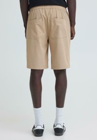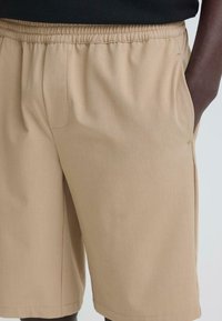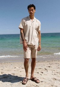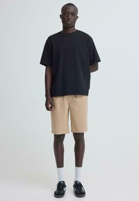 Homme portant un short beige mi-cuisses, des chaussettes blanches et des baskets noires, debout devant un fond clair uni.