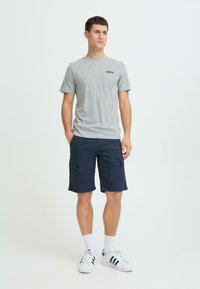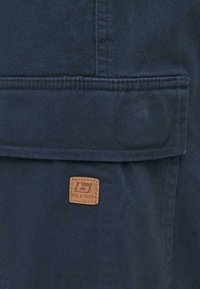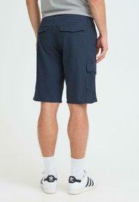 Shorts cargo bleu marine foncé en coton, dotés de deux poches latérales, d'une coupe droite et d'une fermeture à boutons. Portés avec des chaussettes blanches et des baskets.
