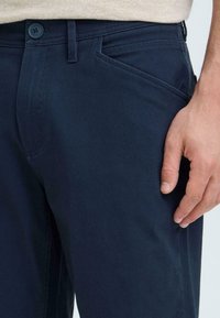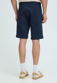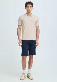 Homme portant un short bleu marine, des chaussettes blanches et des baskets beiges, debout devant un fond gris clair.