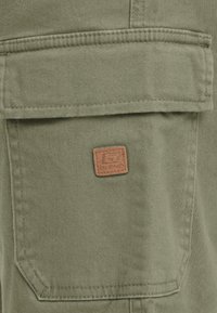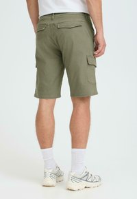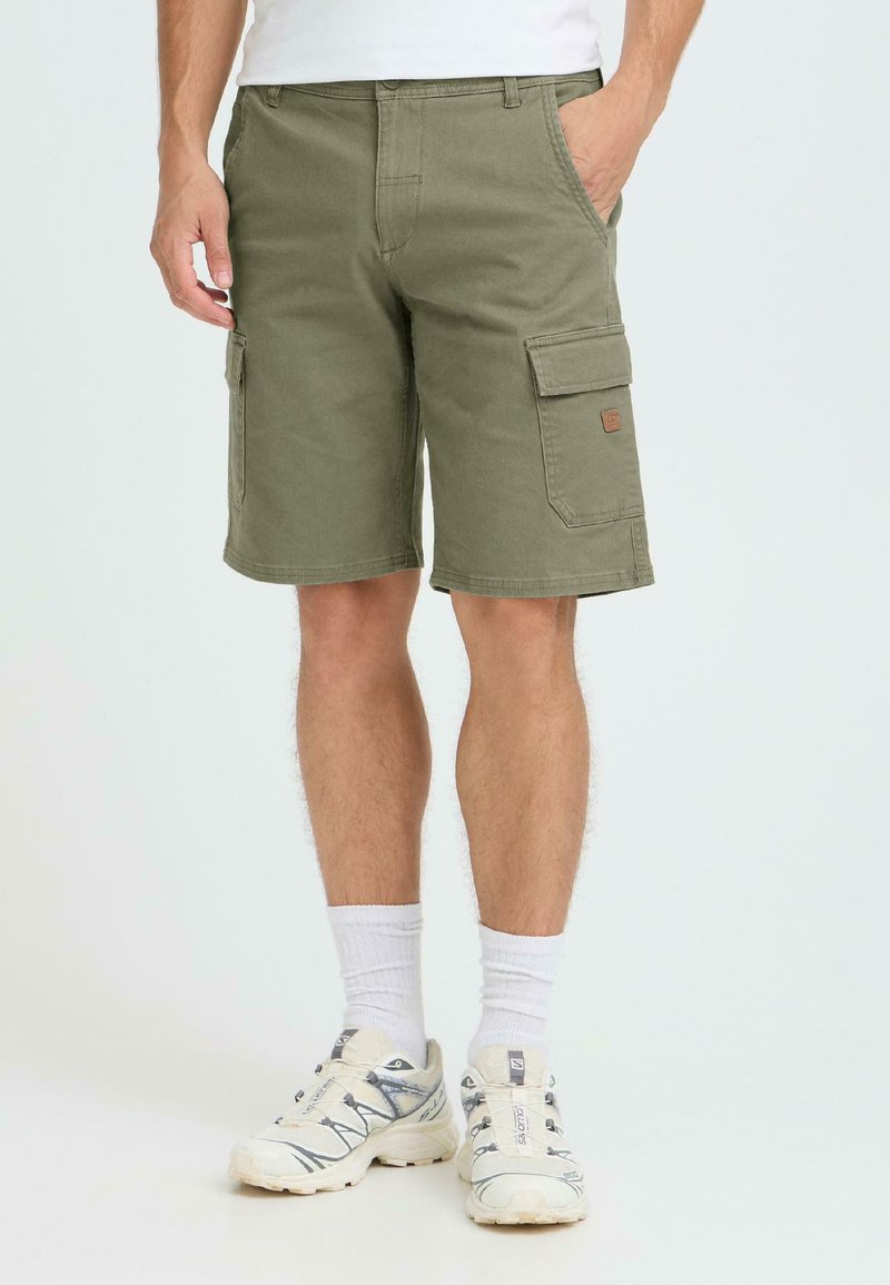 Shorts cargo vert olive en coton avec plusieurs poches, une coupe mi-longue et une ceinture avec passants pour ceinture. Portés avec des chaussettes blanches et des baskets.