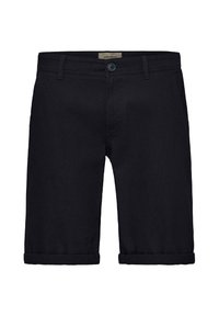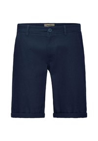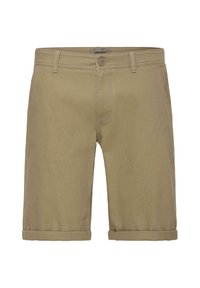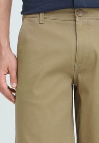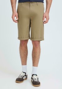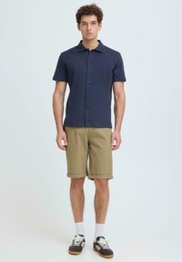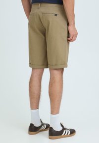 Homme portant un short beige retroussé, des chaussettes blanches et des baskets Adidas noires et blanches, debout sur un fond uni.