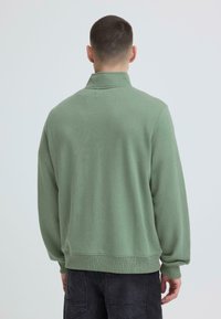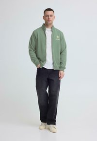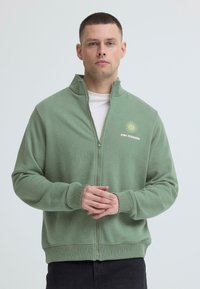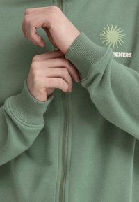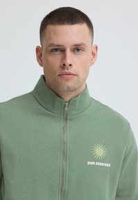 Homme aux cheveux courts portant une polaire zippée verte avec l'inscription « Sun Seekers » et un graphique de soleil, debout devant un fond clair uni.