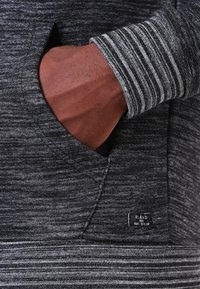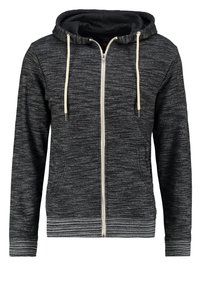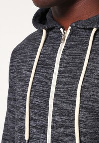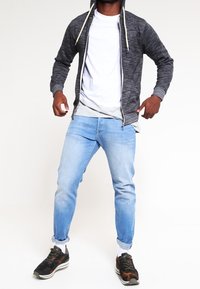 Homme portant un sweat à capuche zippé gris foncé avec des cordons blancs, un t-shirt blanc en dessous, et un jean bleu clair.