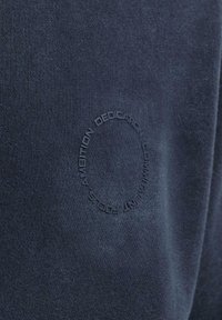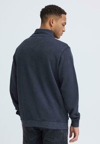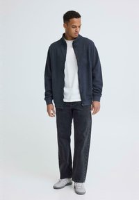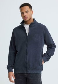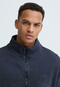 Jeune homme aux cheveux courts et bouclés, portant une veste polaire zippée bleu marine et un pantalon foncé, debout devant un fond clair uni.