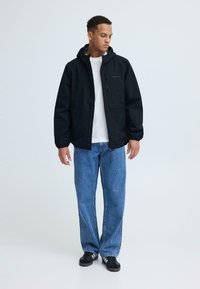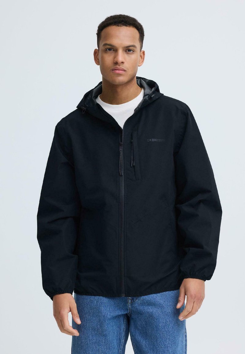Homme portant une veste noire à capuche zippée, chemise blanche en dessous et jean bleu, debout devant un fond clair uni.